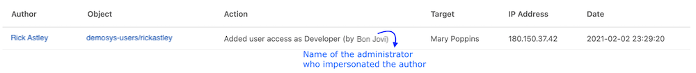 When a user is being impersonated, their actions are logged as audit events as usual, with two additional details: