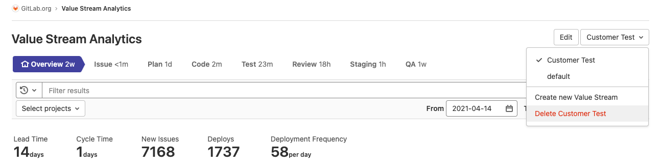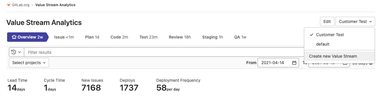GitLab allows users to create multiple value streams, hide default stages and create custom stages that align better to their development workflow.