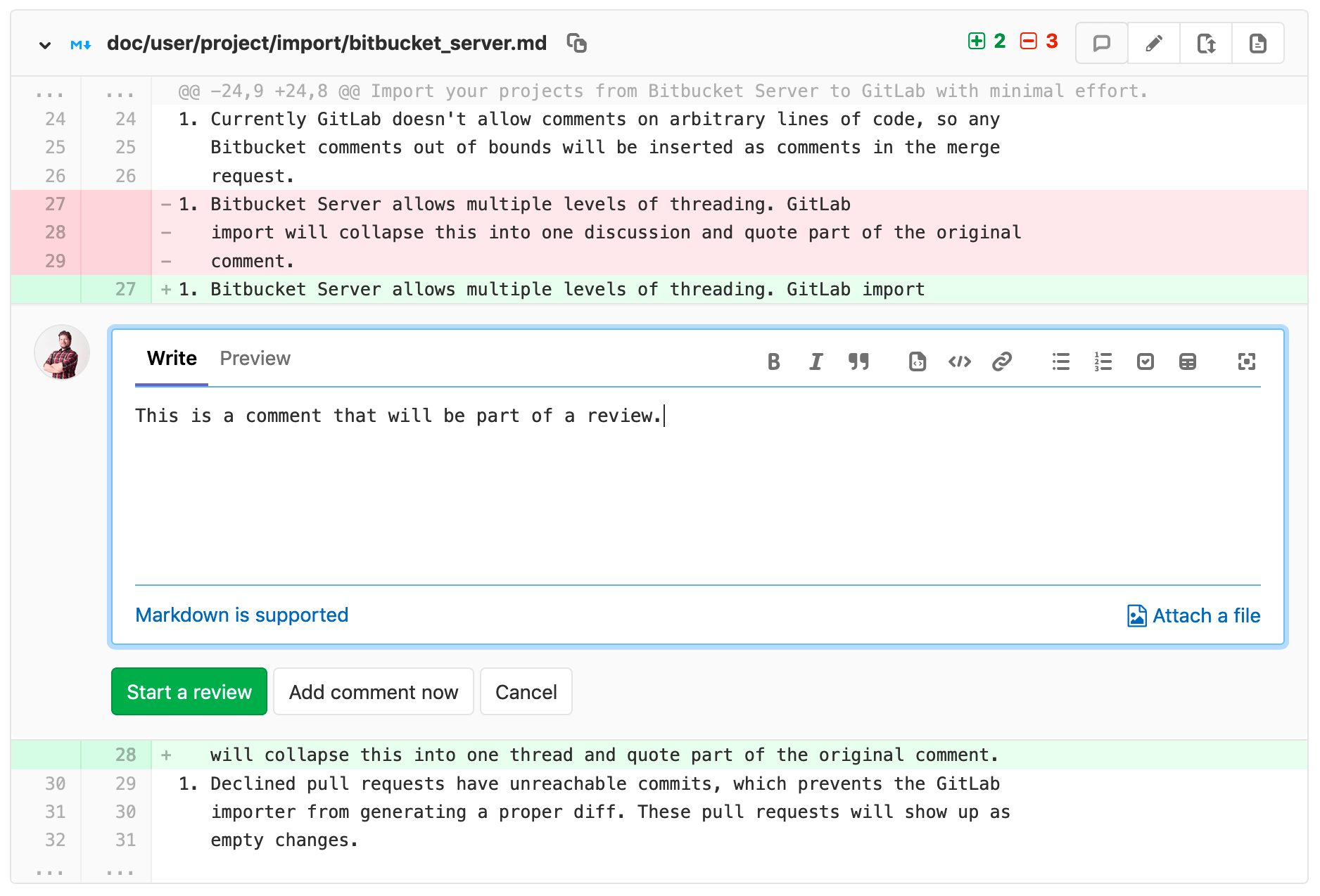 - Select the {comment} comment icon in the gutter to expand the diff lines and display a comment box. In GitLab version 13.2 and later, you can select multiple lines.